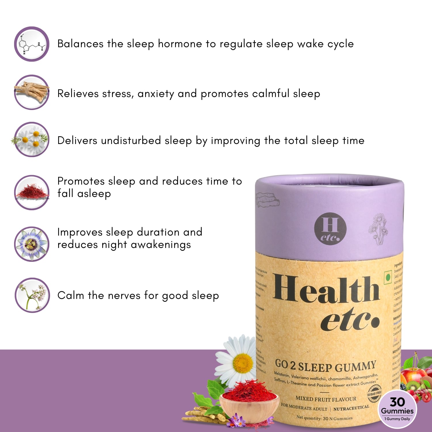 - Melatonin – Balances the sleep hormone to regulate the natural sleep–wake cycle.